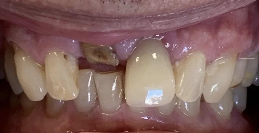 Пациент, мужчина 78 лет, обратился на консультацию по поводу перелома правого верхнего центрального резца (зуб 1.1) (Фото 1). Он пользовался временным частичным протезом для замещения коронки зуба. Пациент выразил желание заменить зуб имплантатом. При изучении анамнеза значимых соматических заболеваний не выявлено.