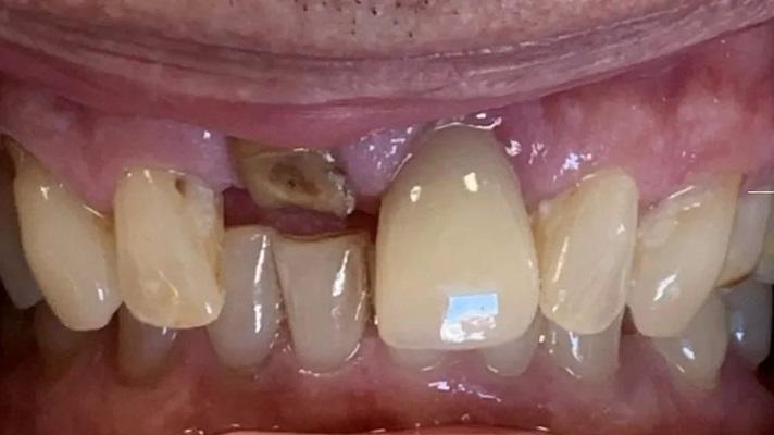Пациент, мужчина 78 лет, обратился на консультацию по поводу перелома правого верхнего центрального резца (зуб 1.1) (Фото 1). Он пользовался временным частичным протезом для замещения коронки зуба. Пациент выразил желание заменить зуб имплантатом. При изучении анамнеза значимых соматических заболеваний не выявлено.