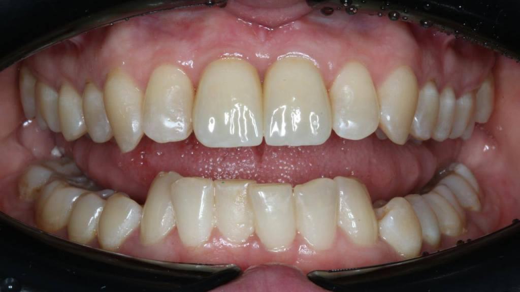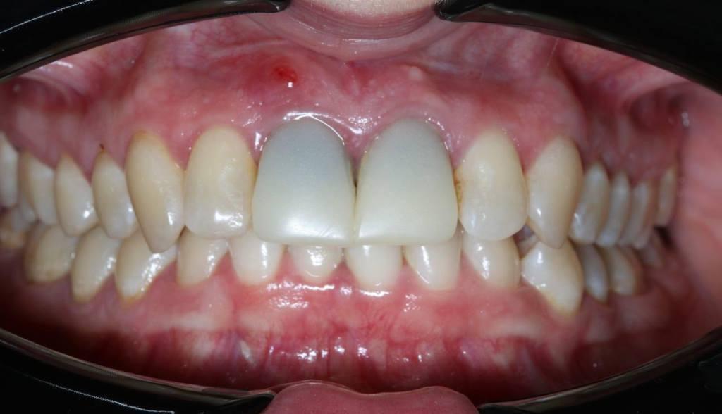 Пациентке около 40 лет. Еще в детстве она упала с велосипеда и повредила два центральных зуба на верхней челюсти.