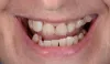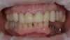 Через 3 месяца после заживления тканей вокруг имплантатов были получены двухслойные оттиски (Panasel, Kettenbach) и сформированы трансферы методом закрытой ложки. Композитные коронки были замещены металлокерамическими аналогами, которые фиксировали на цемент Fuji IX (фото 4 и 5). Контрольные осмотры пациента были проведены через 3, 6 и 12 месяцев после имплантации. При сравнении рентгенограмм удалось установить факт повышения уровня периимплантатной костной ткани в результате реакции кости на действие нагружающих сил. Также благодаря сохранению объема околозубных сосочков удалось добиться максимально эстетических результатов реабилитации (фото 6).