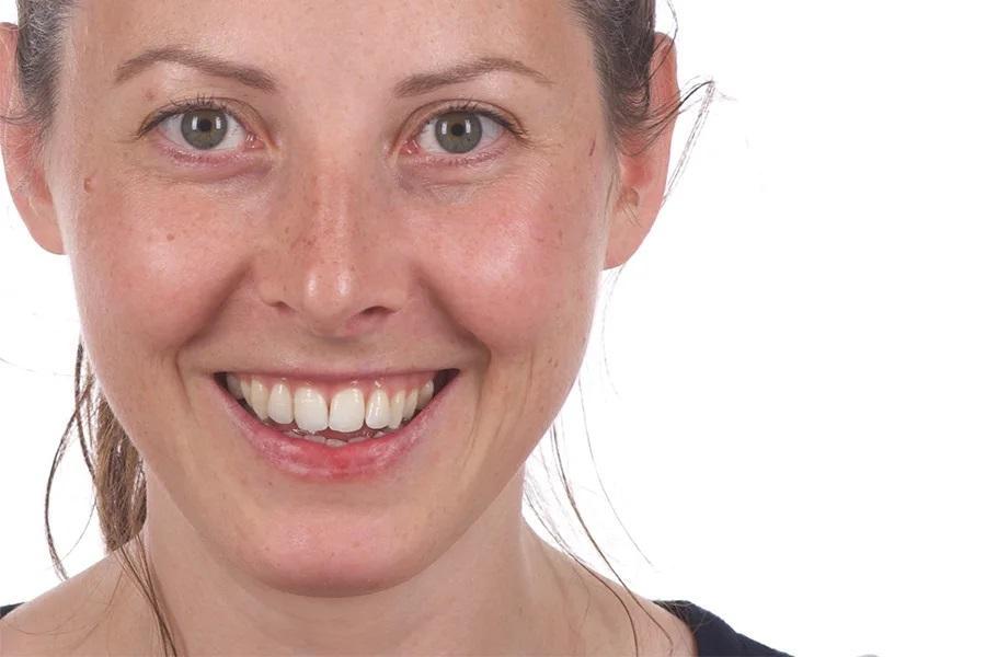 Фото 3. Исходная внеполостная оценка при легкой улыбке; отмечаются десневая улыбка и асимметрия щечных коридоров.
