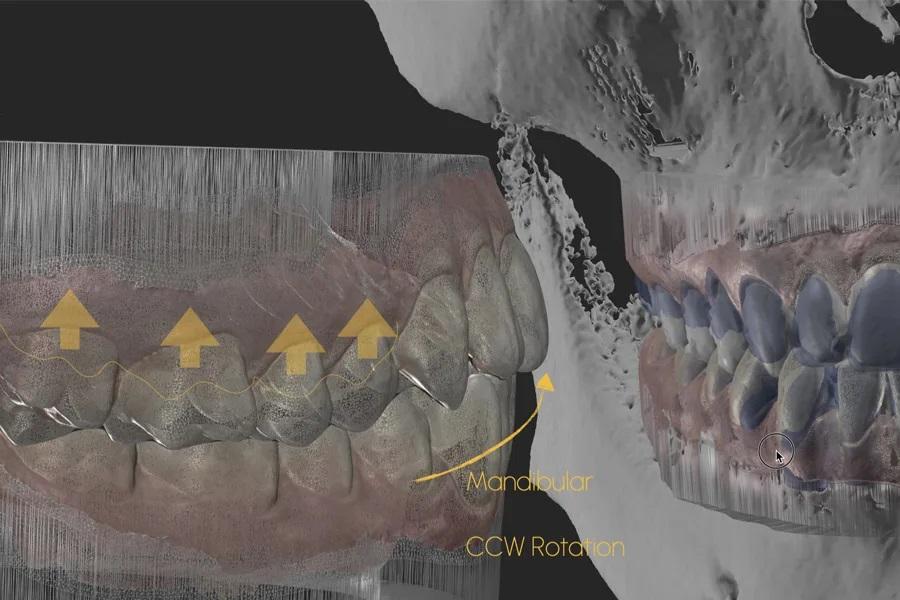 Необходимо определить целевой вертикальный размер окклюзии, стратегию центральной окклюзии/максимальной интеркуспидации и функциональное пространство движений, чтобы избежать избыточного сагиттального перекрытия или нарушения переднего ведения. Для более точного планирования авторотации могут использоваться цифровое отслеживание движений нижней челюсти или 4D-аксиография.