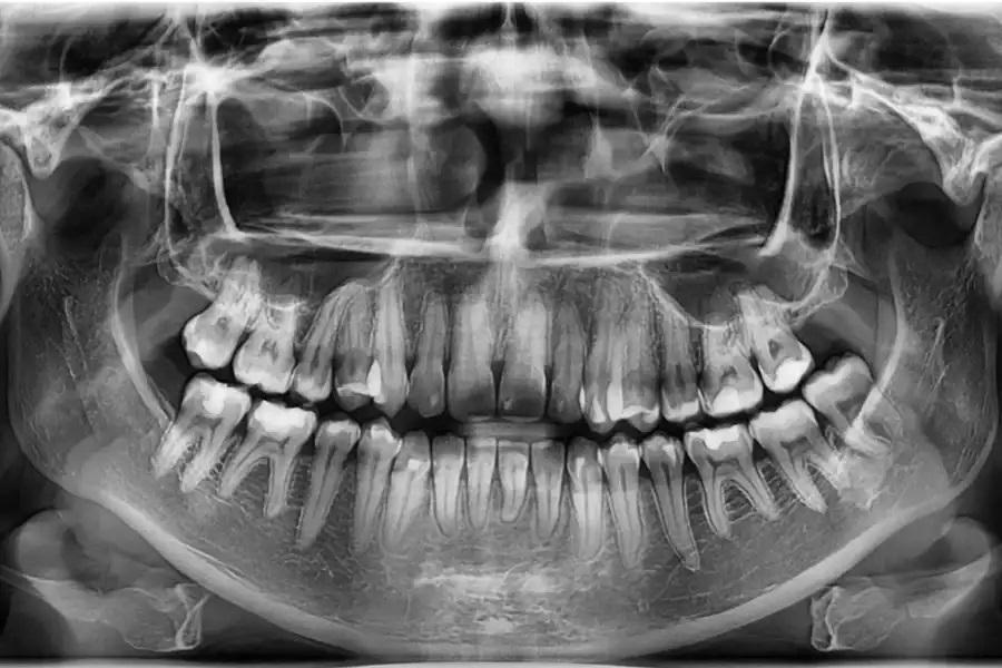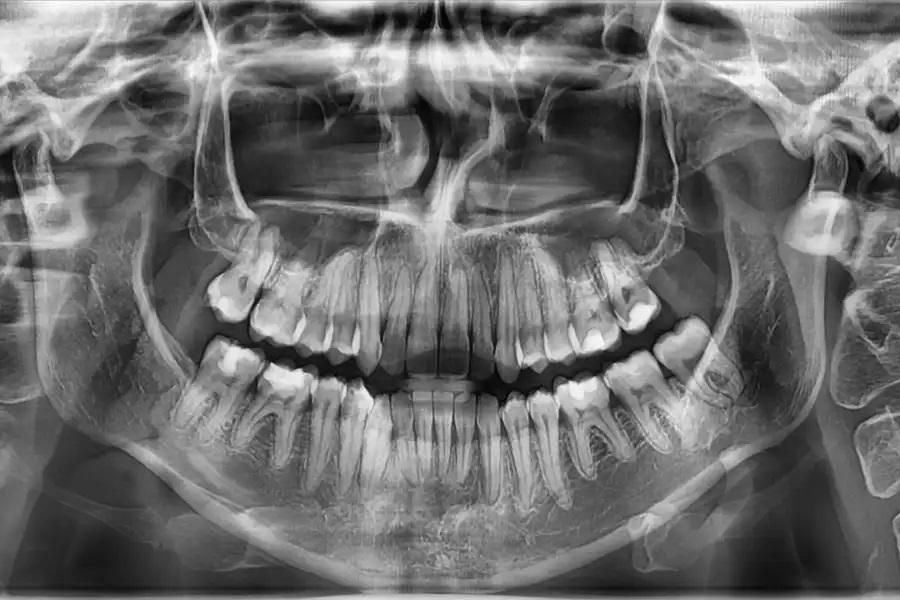 Фото 17. Панорамная рентгенограмма до лечения. Базовое изображение, демонстрирующее исходные дентоальвеолярные взаимоотношения. В области премоляров и моляров отмечается нормальный уровень краевой кости и прикрепления, служащий ориентиром для последующего сравнения.