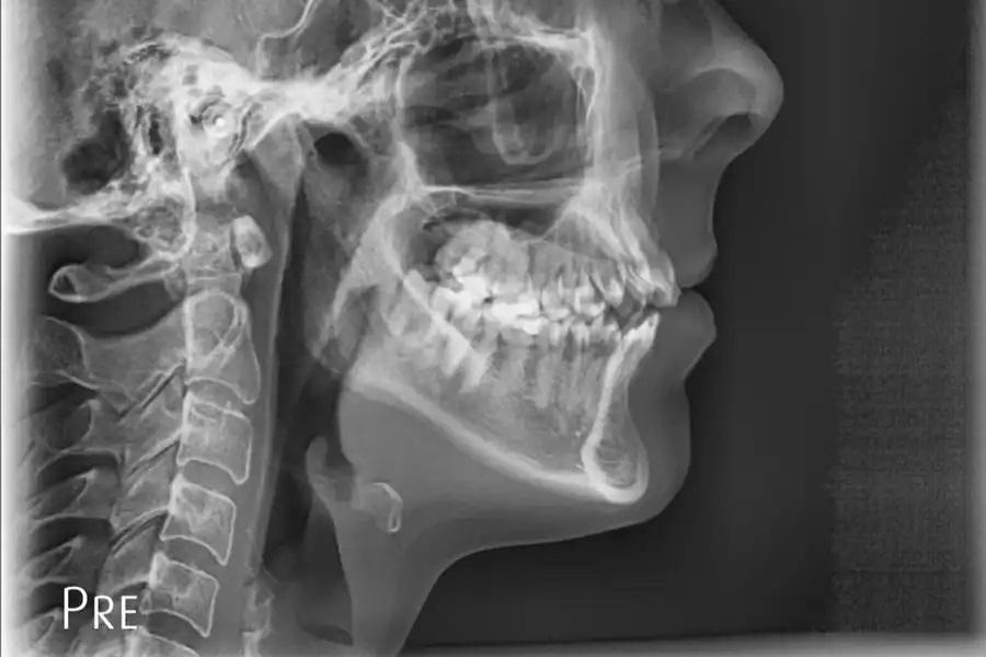 Фото 19. Цефалометрическая рентгенограмма до лечения. Базовая латеральная телерентгенограмма, демонстрирующая исходные скелетные и зубные соотношения. Верхнечелюстная плоскость и окклюзионная кривая имели выраженный наклон, с акцентированной кривой Шпее, тенденцией к открытому прикусу и уменьшенными значениями вертикального и сагиттального перекрытия.