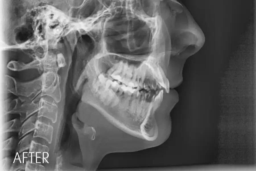 Повторная оценка по данным панорамной рентгенографии и цефалометрии используется для подтверждения интрузии боковых зубов без резорбции корней или изменений в области пазух, улучшения наклона верхних резцов в пределах костной ткани, изменений профиля губ, соответствующих авторотации пр. ч. с., и благоприятных скелетных параметров. (фото 17 – 20)