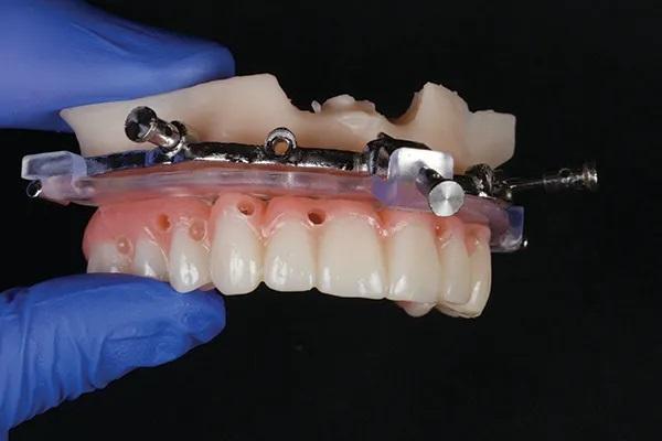 У врача есть возможность провести простой перенос на полиметилметакрилат (ПММА), чтобы пациент мог покинуть прием с фиксированным временным протезом и новой улыбкой в день операции (Фото 5). В качестве альтернативы подбору в кресле можно сделать цифровой фотограмметрический оттиск имплантатов и передать его в лабораторию для немедленного создания временного фиксированного протеза, который затем может быть отпечатан в 3D-формате на месте. Такой подход становится все более распространенным, поскольку значительная часть стоматологических клиник, выполняющих протезирование полного зубного ряда, оснащена 3D-принтерами.