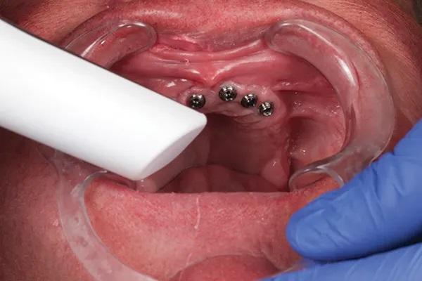 Металлический шаблон для уменьшения костной массы, напечатанный на 3D-принтере, фиксируется винтом к кости челюсти (Фото 3) после определения его предполагаемой ориентации с помощью окклюзионного шаблона, используемого для обеспечения правильной фиксации шаблона для уменьшения объема кости. Окклюзионный шаблон фиксируется на резцовой и окклюзионной поверхностях существующих зубов. После завершения уменьшения объема кости и удаления зубов на металлическом шаблоне для уменьшениея объема кости фиксируют шаблон для создания ложа импланата для точной, полностью навигационной установки имплантатов (Фото 4).