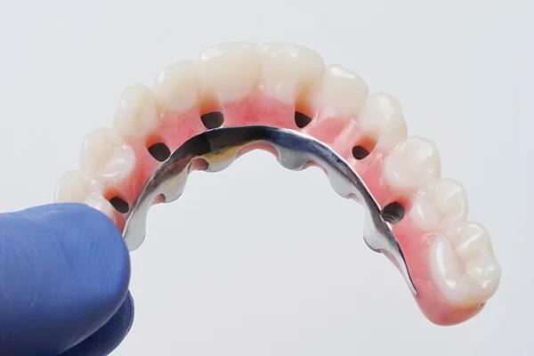Фото 11: Изготовление окончательного гибридного протеза начинается с нанесения самоотвердевающего полимерного цемента на титановые основания и установки их в каркас, после чего удаляются излишки цемента.