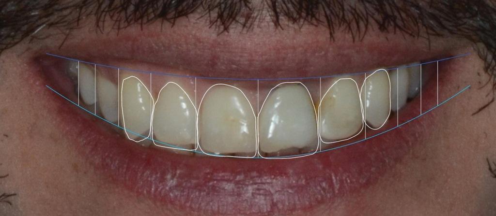 Представленный клинический случай, затрагивающий эстетическую реабилитацию передних зубов, демонстрирует, как врачи могут применять комплексный цифровой рабочий процесс — начиная с цифрового дизайна улыбки и заканчивая компьютерным проектированием и изготовлением окончательных реставраций. В данном случае пациент обратился в клинику автора (MR) с просьбой исправить ухудшившуюся эстетику передних зубов, связанную с несколькими сильно инфильтрированными композитными реставрациями и сколом коронки на эндодонтически пролеченном зубе (2.1) с темным пятном. После комплексной клинической и первичной фотографической оценки (Фото 1 - Фото 3) был проведен цифровой дизайн улыбки (TRIOS Smile Design) для создания цифровой восковой модели передних зубов верхней челюсти с учетом различий в пропорциях зубов и дефектной коронки зуба 2.1 (Фото 4 и Фото 5). Последовательные измерения в таких аспектах, как высота и ширина зуба и изменение режущего края, служат механизмом строгого контроля качества, помогая обеспечить прецизионность и точность на протяжении всего процесса проектирования и лечения.
