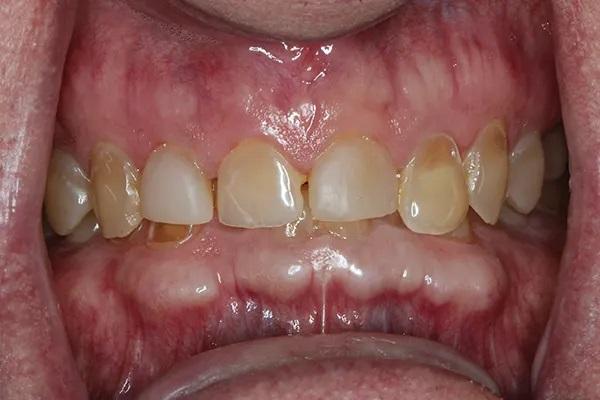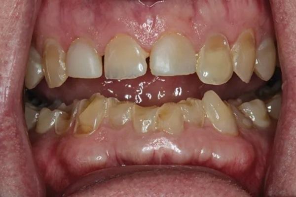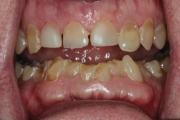 Стоматологический анамнез пациента включал истончение и сколы зубов, ограниченное открывание рта, усталость челюстей и неспособность употреблять твердую пищу. Он сообщил, что предыдущие стоматологи говорили ему, что он скрежещет зубами. Он также сообщил о сухости во рту.
