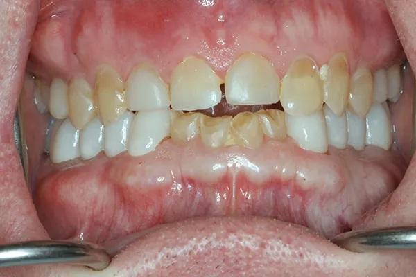 Фото 3: Передние зубы до лечения. Обратите внимание на сильное разрушение большинства зубов пациента.