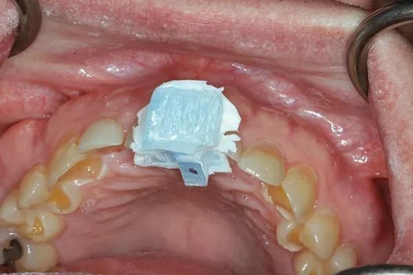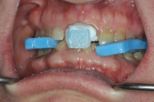 На передние зубы верхней челюсти и премоляры были установлены полные реставрации из диоксида циркония. Увеличенный вертикальный размер, предусмотренный в нижнем зубном ряду, привел к появлению переднего открытого прикуса, что позволило значительно сократить количество удаляемой структуры зубов во время препарирования их зубов. Временные реставрации были изготовлены на основе оригинальной восковой модели с использованием временного материала (Luxatemp). Для переноса восковой модели в рот была использована силиконовая матрица, и реставрации были обрезаны и отполированы у кресла стоматолога. Реставрации верхней челюсти с полным покрытием были выполнены по ранее описанному протоколу.