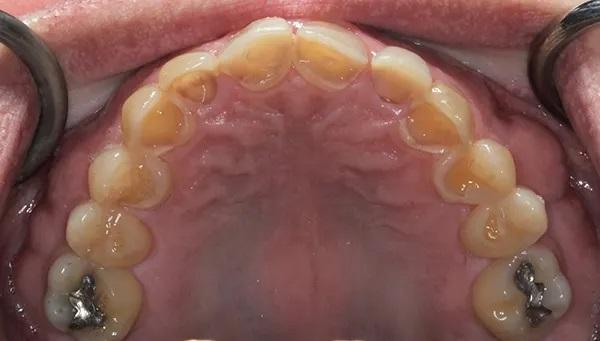 Фото 4: Верхняя челюсть: вид с окллюзионной стороны до лечения Обратите внимание на сильную потерю эмали.