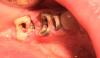 2. Рабочий визит на 3-й день. Как видим десна уже спокойнее и можно работать, но все же для защиты рабочего поля от биологической среды по контуру края коронок была введена тефлоновая лента. Как видите результат отличный.