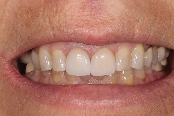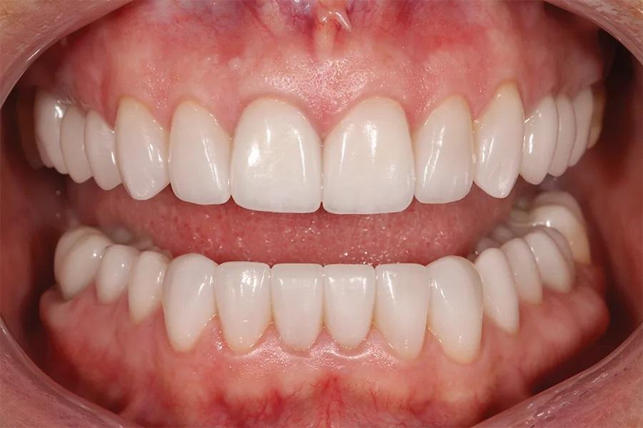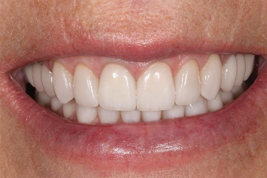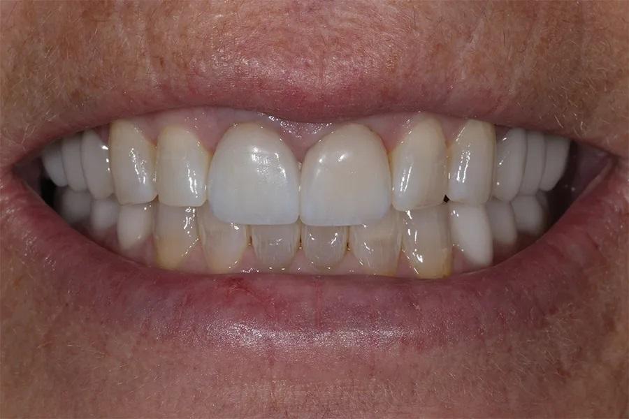 Фото 13. Крупный план улыбки после лечения, демонстрирующий целостность и согласованность реставраций, улучшающих общий вид улыбки.