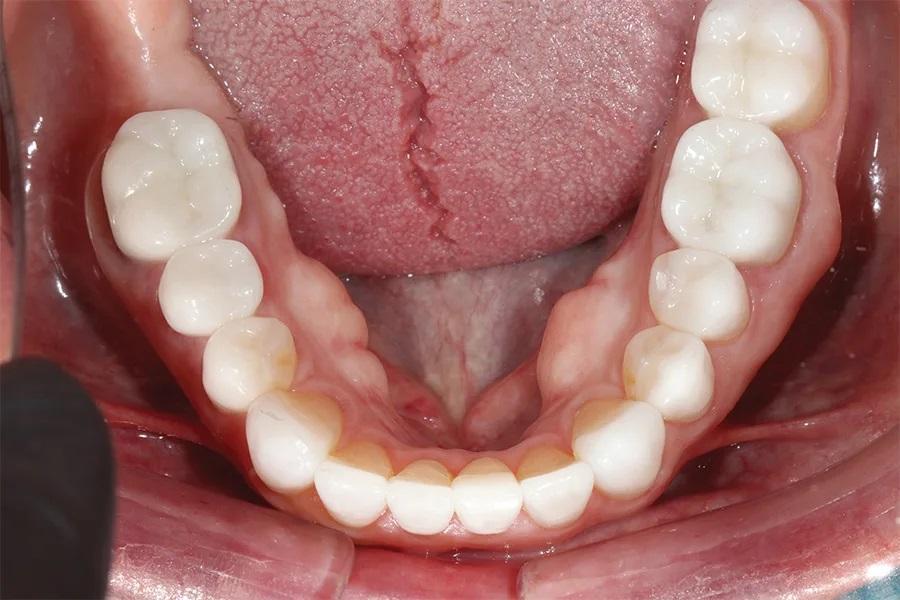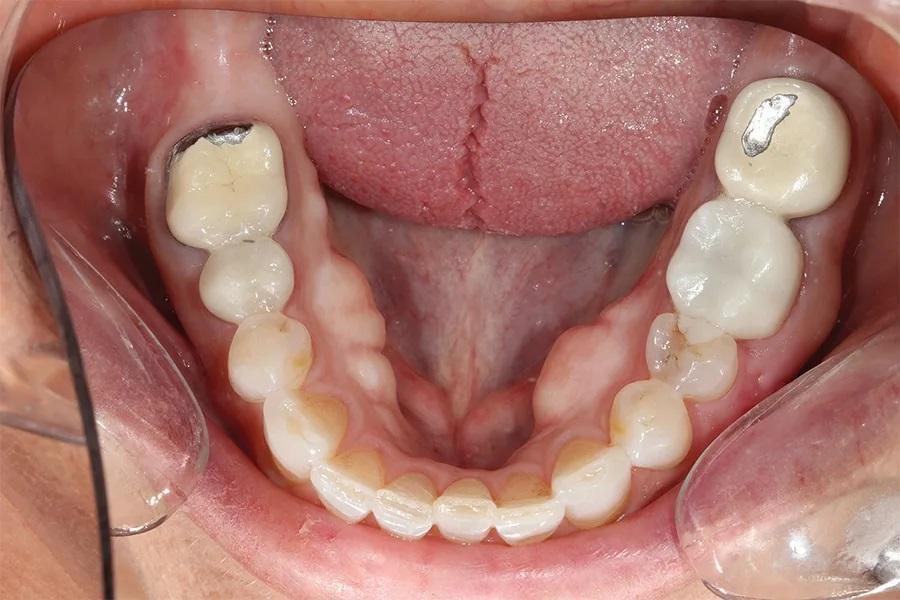 Фото 6. Окклюзионный вид нижней челюсти до лечения, демонстрирующий износ режущих краев и существующих металлокерамических коронок.