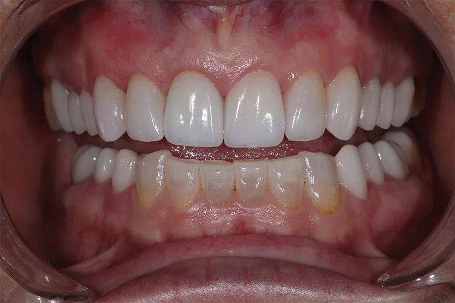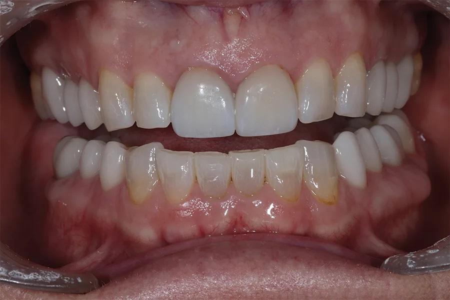 Окклюзия была скорректирована для обеспечения одновременных, равномерных и двусторонних контактов одинаковой интенсивности. Для контроля интенсивности контактов использовалась фольга «Шимсток». Пациентка носила временные конструкции в течение 2 недель для оценки новой окклюзии и эстетики перед изготовлением постоянных реставраций.
