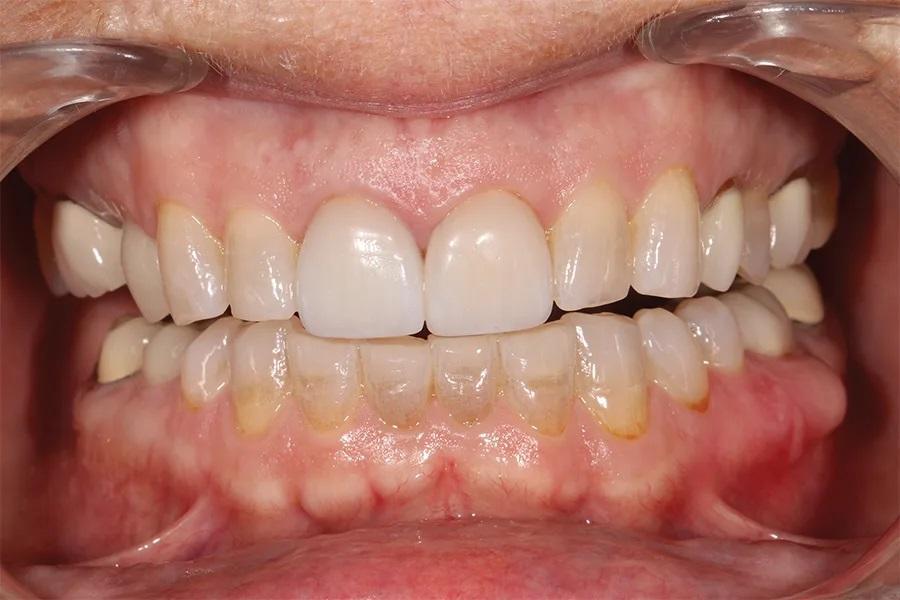 Через 5 недель пациентка явилась на примерку и фиксацию оставшихся шести реставраций e.max на зубах 33–43. Примерка и фиксация проводились по ранее описанному протоколу. Окклюзия была проверена с использованием артикуляционной бумаги и фольги «Шимсток».