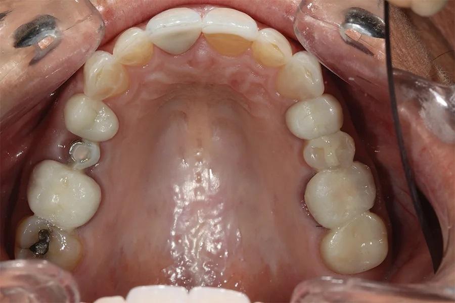 Фото 4. Окклюзионный вид верхней челюсти до лечения, демонстрирующий разрушенную временную конструкцию на имплантате в области зуба 15 и фрикционный износ на небной поверхности зубов 13–23.