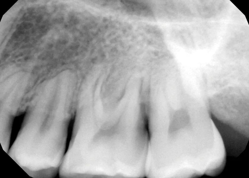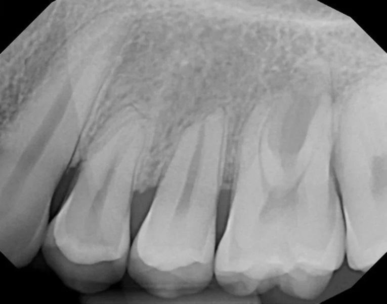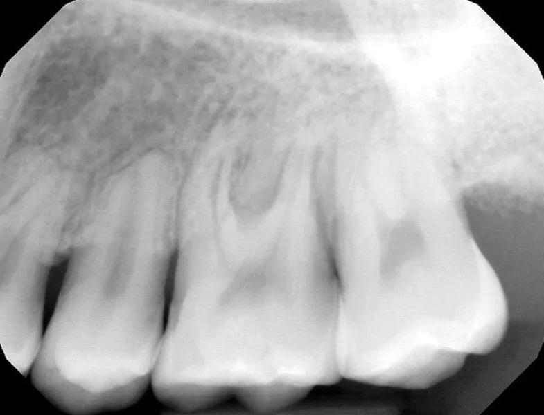 Фото 3. Предоперационный периапикальный рентгеновский снимок, показывающий короткие, затупленные корни зубов № 2.4, с апикальной резорбцией корня зуба № 2.5 и дистального щечного корня зуба № 2.6. Отмечалась тесная близость корней зубов №№ 2.6 и 2.7 с умеренным образованием интерпроксимальных кариозных полостей. Рентгенологическое просветление в основном затрагивало фуркацию зуба № 2.6.