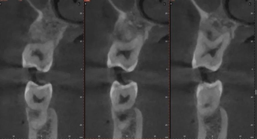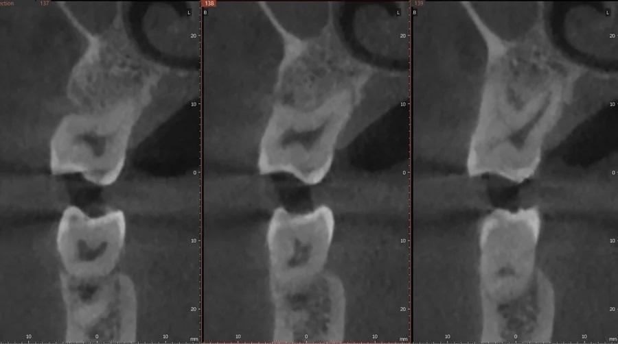 Фото 8 – Фото 11. Периапикальный рентгеновский снимок (Фото 10) и КЛКТ-изображение (Фото 11) на шестом месяце, показывающие костное наполнение и улучшение плотности в области фуркации в локализации зуба № 2.6.