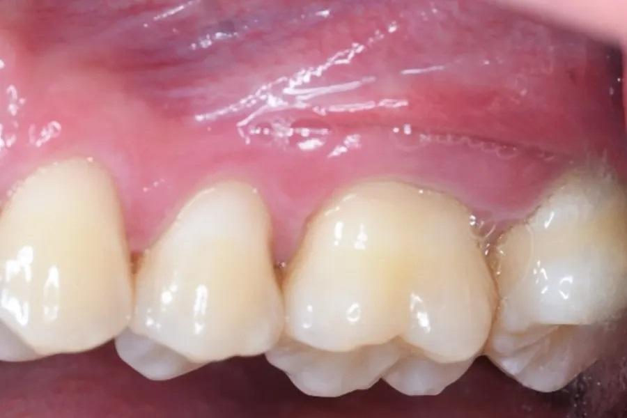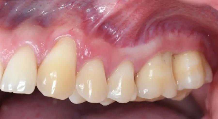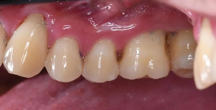 Фото 1 и Фото 2. Внеоральный осмотр выявил легкую болезненность в левом ВНЧС; интраоральный осмотр показал тонкий фенотип десны, локализованную рецессию десны и потерю клинического прикрепления. Предоперационные вестибулярный (Фото 1) и окклюзионный (Фото 2) виды показали воспаление десны, минимальную рецессию и глубину зондирования 12 мм с вестибулярной поверхности зуба № 2.6.