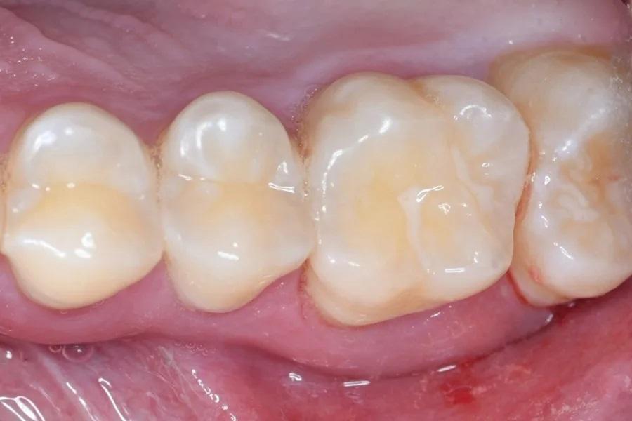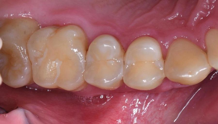 Фото 5. До операции зуб № 2.6 демонстрировал крутые плоскости бугров и фасетки стираемости.