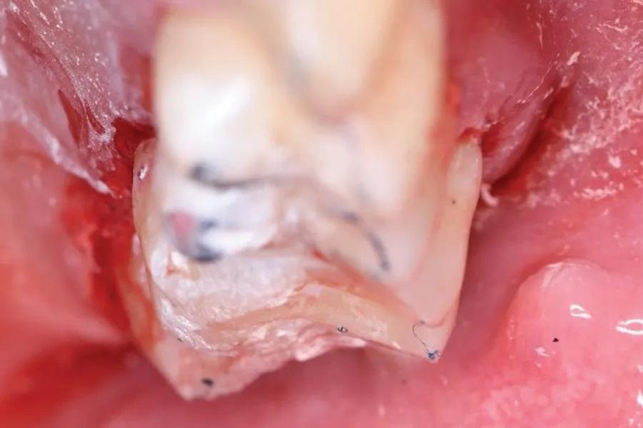 Фото 6. Окклюзионный вид во время значительной окклюзионной коррекции в рамках протокола лазерного лечения LANAP. В борозде зуба № 2.6 присутствовал локализованный гемодинамически стабильный кровяной сгусток. Тупое рассечение и декортикация кости высвобождают стволовые клетки пациента. Лазерное облучение формирует стабильный кровяной сгусток с живыми жизнеспособными клетками.