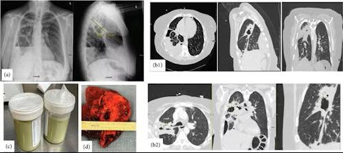 Фото 1: (а) Первичная рентгенография грудной клетки при поступлении показывает обширное гетерогенное помутнение правого легкого, которое, по-видимому, представляет собой толстостенное полостное образование размером около 4,8 × 10,5 см. Умеренный правосторонний гидропневмоторакс у основания легкого с сопутствующим уровнем жидкости и воздуха, что указывает на эмпиему. (b) b1: Утолщение или повреждение полости с толстыми стенками в задней правой верхней доле. Имеется сложный умеренный выпот в правой плевре с содержанием воздуха и жидкости, что указывает на эмпиему. В правом легком имеется обширное парабронхиальное утолщение. b2: Компьютерная томография грудной клетки после введения трубки; желтый маркер указывает на бронхолегочный свищ, который был причиной постоянной утечки воздуха. (c) Гной после введения грудной трубки. (d) Абсцесс правой верхней доли после лобэктомии.
