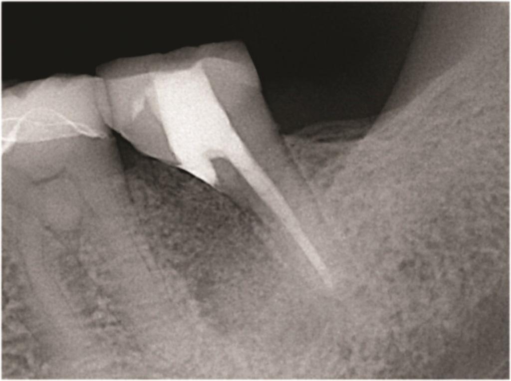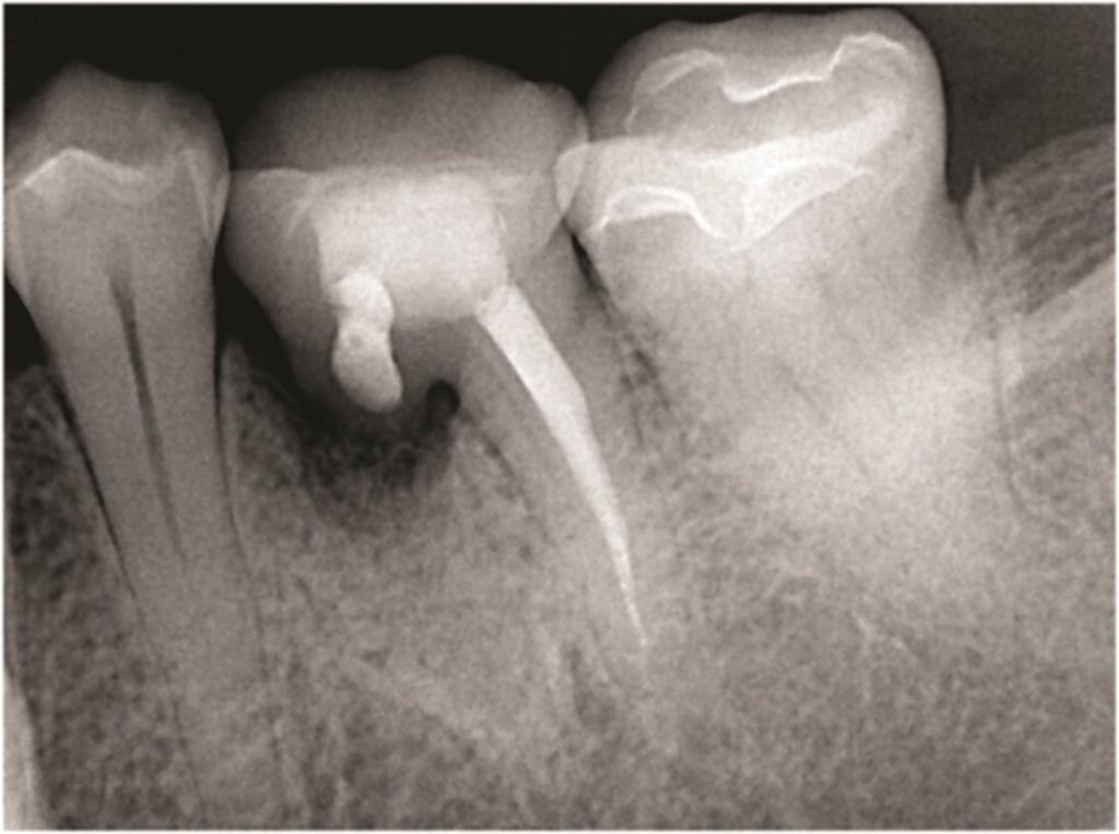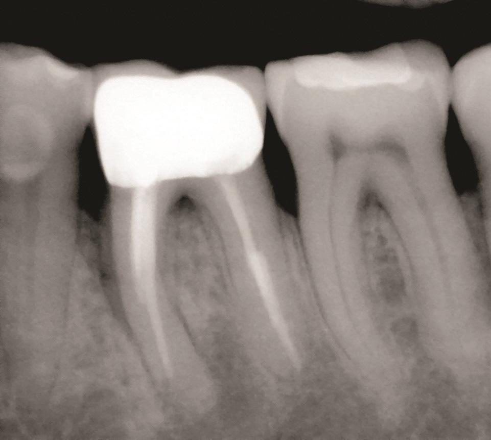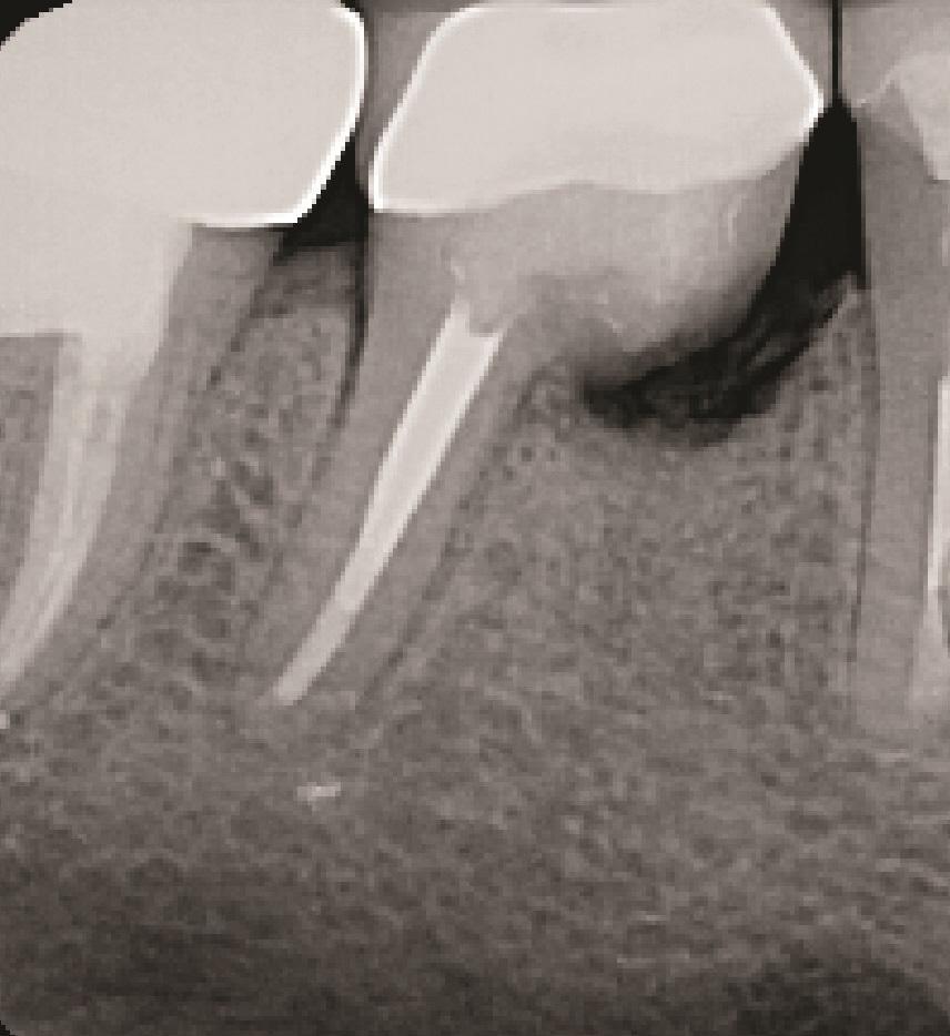 Фото 2: Зуб 4.6 с ранее проведенным апикальным хирургическим вмешательством, показывающий потерю кости вокруг переломанного мезиального корня.