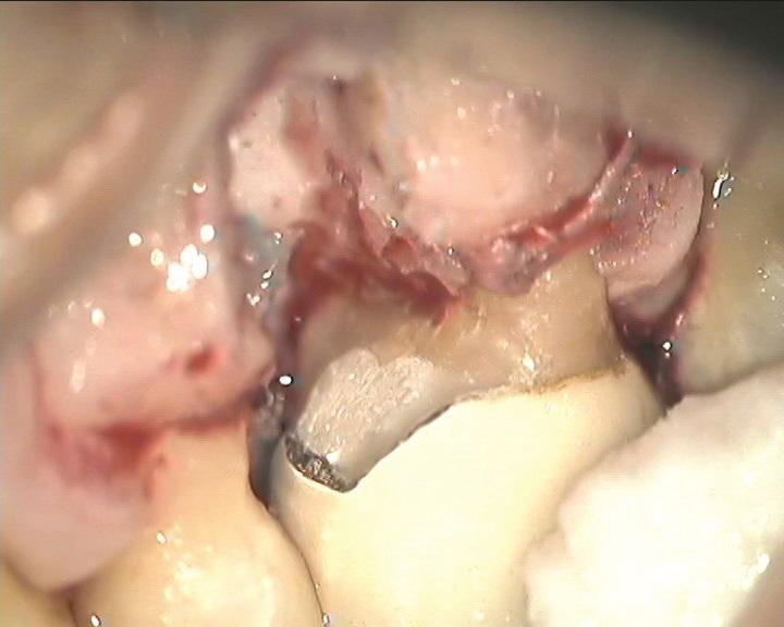 Фото 7: Зуб 3.7 непосредственно после резекции мезиального корня. Мезиальная поверхность имеет плавный переход к контактной зоне. Нижняя часть консоли восстановлена СИЦМ, а лунка заполнена аллогенным материалом.