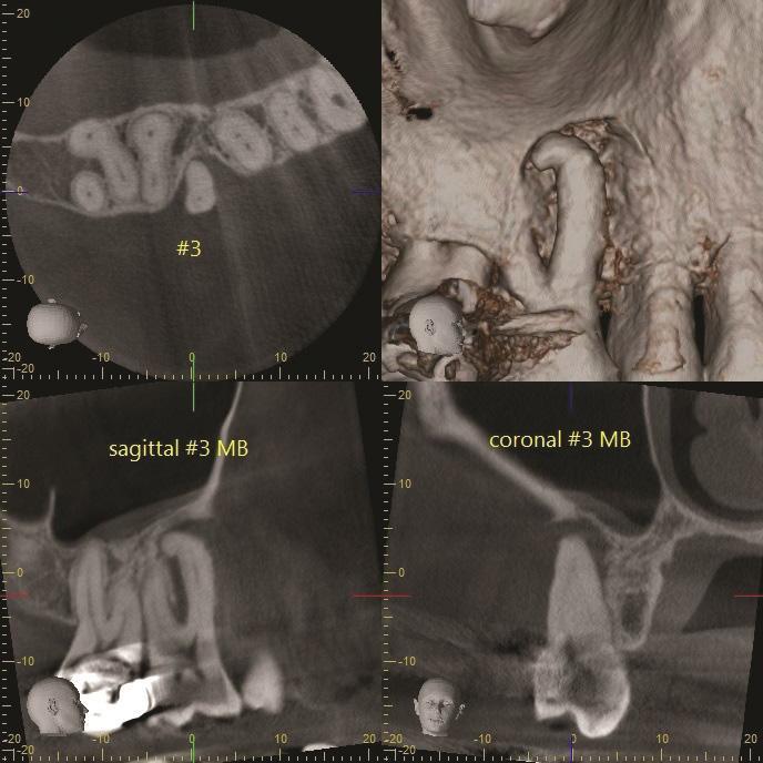 Фото 4: 3D-изображение КЛКТ зуба 1.6, демонстрирующее апико-маргинальный дефект кости, затрагивающий мезиально-щечный корень при стабильных сросшихся дистально-щечном и небном корнях.