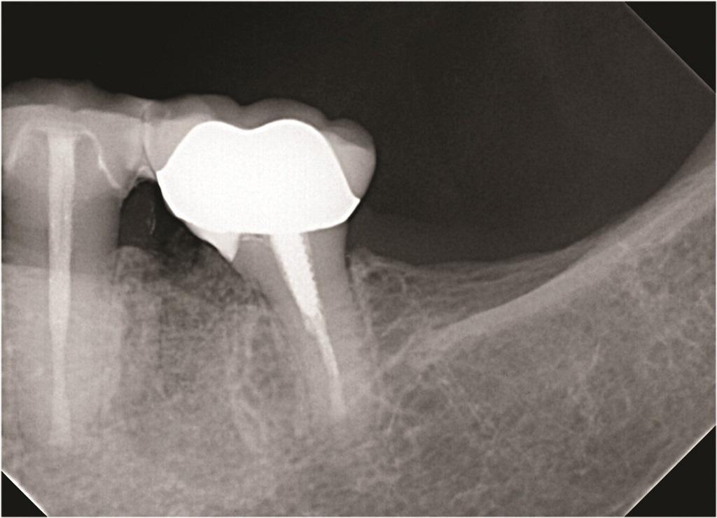 Фото 1: Зуб 1.6 с дистально-щечным корнем, демонстрирующим циркулярную потерю кости от уровня краевой кости до верхушки при стабильных мезиально-щечном и небном корнях.