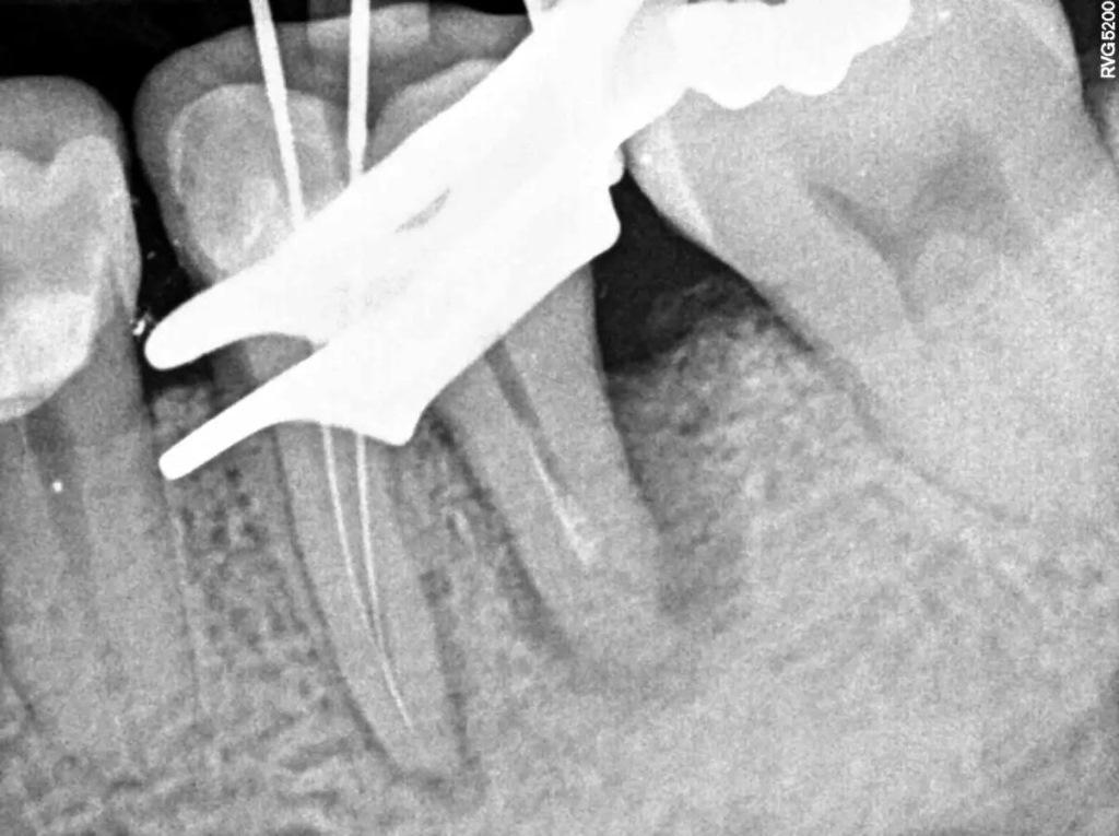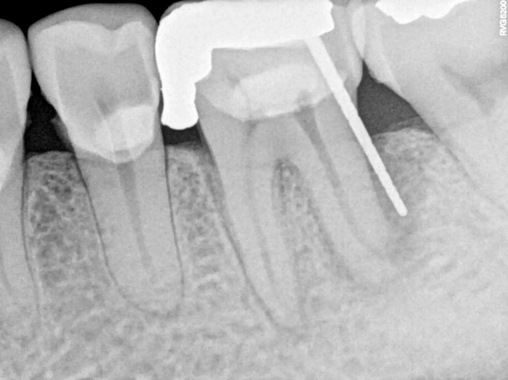 50-летний пациент с системным заболеванием, не вызывающим сопутствующих заболеваний, обратился с основной жалобой на боль при жевании. Он сообщил, что шесть месяцев назад ему была проведена прямая реставрация первого коренного зуба левой нижней челюсти. При клиническом и рентгенологическом обследовании была обнаружена большая, чрезмерно растянутая пломба из амальгамы II класса, а также J-образное просвечивание дистальной части зуба (фото 1). Также наблюдались дистально ориентированная буккальная припухлость и признаки окклюзионного износа, характерные для бруксизма зубных рядов. Зуб болезненно реагировал на перкуссию и отрицательно реагировал на электрические и тепловые стимулы. При зондировании в области абсцесса был выявлен изолированный карман диаметром 9 мм (фото 2). У зуба был диагностирован некроз пульпы и периапикальный абсцесс, а также подозрение на VRF. Для подтверждения предполагаемого диагноза была подготовлена полость доступа под изоляцией коффердамом и под стоматологическим операционным микроскопом. Когда предыдущая реставрация была удалена, на дистальной стороне дна пульпы при увеличении в 10 раз была обнаружена линия продольной трещины.