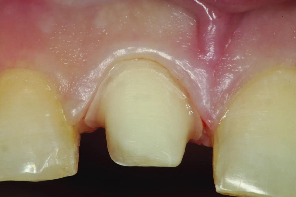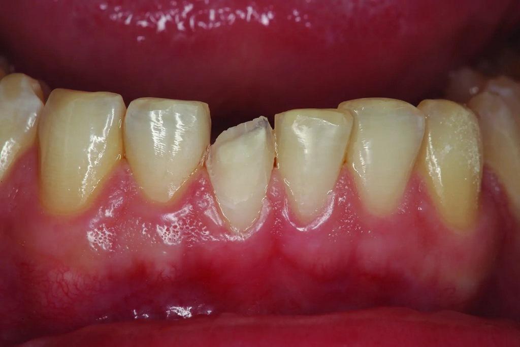 Пациент обратился со сколом композитной реставрации IV класса на зубе 11 по причине дефекта (фото 1). За последний год проводили реставрацию трижды и она снова скалывалась. Было ли это из-за плохой техники или по причине некачественных материалов? Более чем вероятно, что это произошло из-за окклюзии. Помимо большого количества композита на лицевой поверхности, который выходил за пределы области скола, большая часть небной поверхности зуба была стерта до дентина из-за гиперфункции при протрузии и боковом перемещении в течение многих лет, что создавало для пациента функциональную и эстетическую дилемму. «Консервативный» подход, возможно, заключался в том, чтобы снова заклеить зуб композитом и надеяться на лучшее. Однако, возможно, это был не самый лучший долгосрочный подход, учитывая функциональную нагрузку в этой области, даже при наилучшем выравнивании зубов. В конце концов, насколько консервативно постоянное воздействие на зуб вращающимися инструментами для фиксации композита, который продолжает разрушаться?