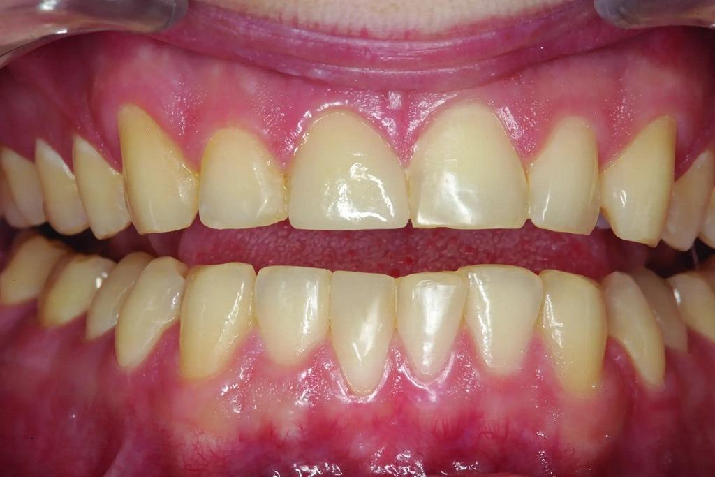 Фото 6: Лингвальный аспект зуба 41 заделывается композитным материалом для перемещения резцового края зуба на языке в более благоприятное положение.