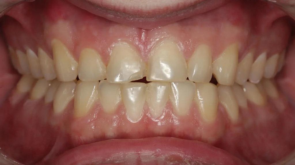 Для исправления выравнивания зубов с пациентом обсуждалась ортодонтия, но он не пожелал использовать этот вариант. Альтернативный план лечения заключался в восстановлении зуба 41 таким образом, чтобы положение зуба на лицевой стороне и его резцовый край преждевременно не соприкасались с небной поверхностью зуба 11, а затем в восстановлении небной поверхности и лицевой области перелома резца керамикой для замены утраченной эмали и укрепления оставшейся структуры зуба. Было принято решение восстановить зуб 11 керамической коронкой, а зуб 41 - прямой композитной реставрацией. Для зуба 11 эстетическое соответствие зубу 21 лучше достигалось при послойном нанесении керамики. Композит был выбран как более консервативный и менее затратный вариант для лечения зуба 41, но пациента предупредили, что позже может потребоваться керамическая реставрация.