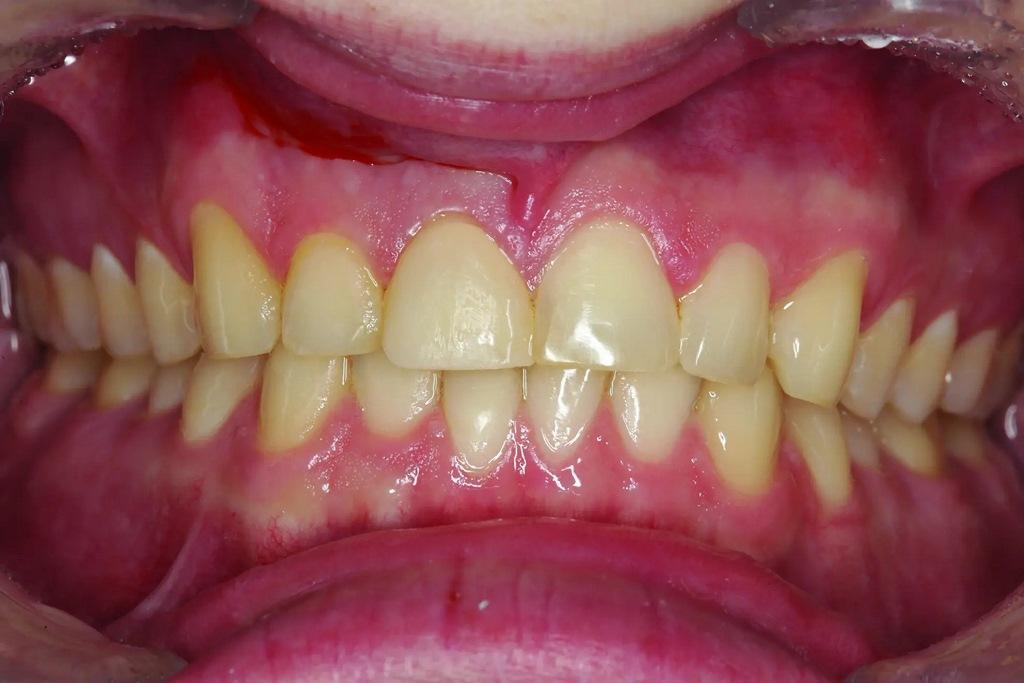 Фото 2: Зубы выступают вперед, что свидетельствует о чрезмерном износе зуба (41), расположенного напротив зуба 11, что указывает на гиперфункцию и повышенную функциональную нагрузку на восстановленную область.