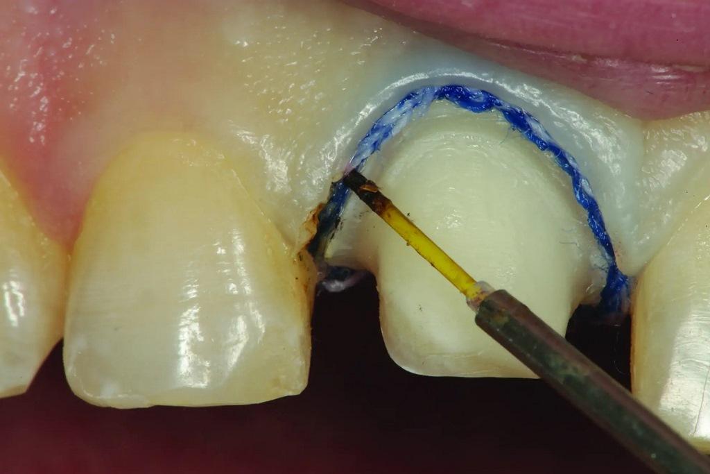 Сначала на основание десневой борозды вокруг каждого места препарирования накладывается ретракционная нить №00 (например, Ultrapak, Ultradent Products), начиная с лингвальной стороны, вокруг лицевой стороны, затем обратно через противоположную проксимальную область к лингвальной начальной точке. Излишки на обоих концах обрезаются, и противоположные концы нити заправляются в лингвально-десневую борозду так, чтобы они прилегали друг к другу, но не перекрывали друг друга. После того, как первая ретракционная нить будет правильно закреплена, и перед установкой второй ретракционной нити можно произвести любую незначительную коррекцию по краям препарирования с помощью крупного или мелкого алмазного инструмента соответствующего диаметра. Затем с помощью ватного тампона места препарирования протирают 2%-ным антибактериальным раствором хлоргексидина (например, средствами Consepsis, Ultradent), чтобы убедиться в чистоте поверхности и отсутствии отходов препарирования с алмазного инструмента. Затем таким же образом поверх нити №00 накладывается нить №1 (например, Ultrapak).
