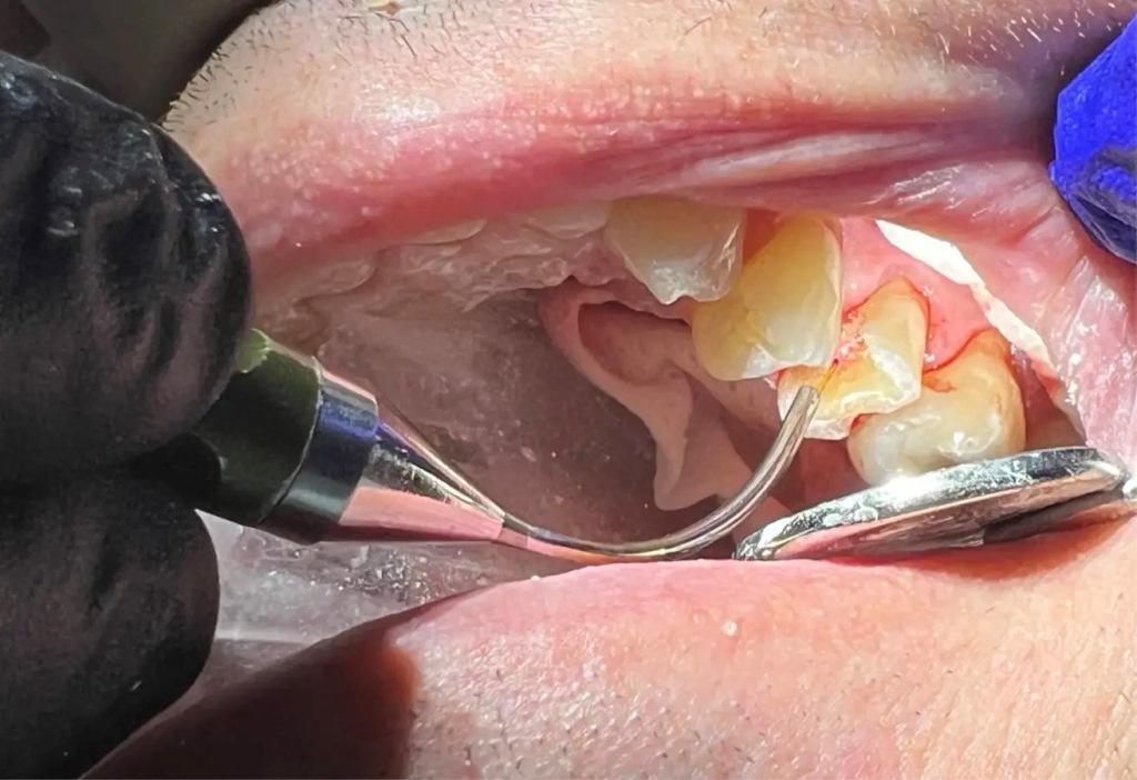 57-летний пациент обратился с жалобами на повышенную чувствительность к температуре в левом квадранте верхней челюсти. Был сделан рентгеновский снимок (фото 2), на котором был отмечен глубокий кариес на втором премоляре с возможным вовлечением пульпы. Периапикальная патология рентгенологически не была отмечена. Чтобы убедиться в жизнеспособности пульпы зуб подвергли испытанию холодом (фриз-тест). При проведении фриз-теста была отмечена слабая реакция, которая немедленно прошла, когда холод был удален с зуба, что указывало на то, что зуб был жизненно важным. Пациенту сообщили, что может потребоваться эндодонтическое лечение, если в результате удаления кариеса произойдет значительное обнажение пульпы или у зуба появятся симптомы после лечения. Если обнаруживается небольшое обнажение пульпы или в результате удаления кариеса дентин над пульпой становится тонким, перед установкой культевой вкладки следует провести лазерную обработку, чтобы стерилизовать область и избежать развития пульпита. Для этого зуба планировалось установить культевую вкладку и полную коронку. Пациент принял рекомендации по лечению.
