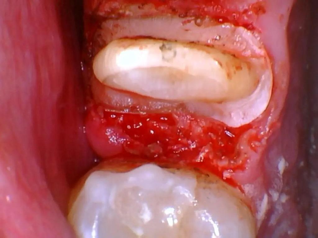 Фото 8: Завершенная подготовка коронки и культевая вкладка на мезиальной поверхности, защищающей поверхность пульпы.
