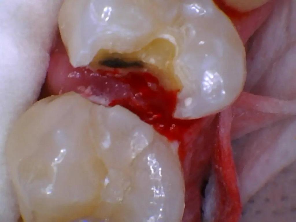Фото 3: Пораженный дентин, заметный в области пульпы после удаления кариеса с мезиальной и окклюзионной сторон.