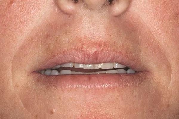 Челюстно-лицевая область: У пациентки отмечен гипертонус губ, нормальная форма альвеолярных гребней и горизонтальная симметрия. состоянии покоя ее правый клык верхней челюсти выступал на 1мм ниже окклюзионной плоскости, в то время как режущий край левого клыка стоял на одном уровне с верхней губой в покое или не так называемом “нулевом уровне”. Губы в состоянии покоя (фото 6). Губа пациента поднялась на 11 мм при переходе из состояния при диагностике гипермобильности по верхней губы по шкале Дюшенна.