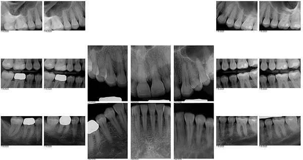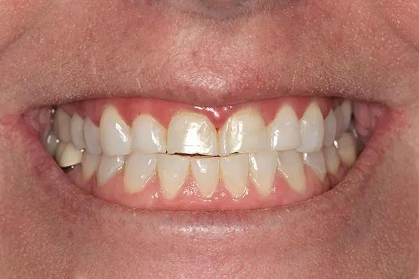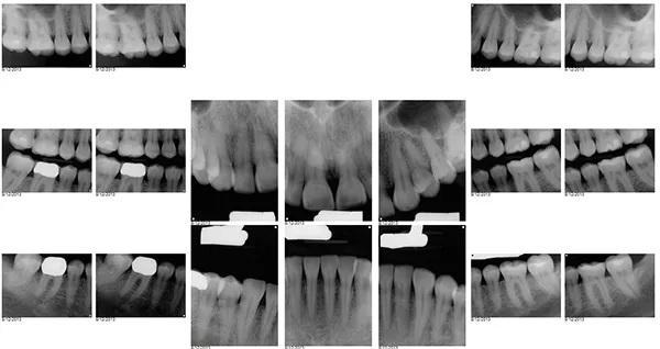 35-летняя пациентка женского пола, наблюдаясь у своего стоматолога с детства выразила заинтересованность в улучшении внешнего вида своих передних зубов, которые в свою очередь, имеют значительные дефекты твёрдых тканей и сколы. Вид улыбки пациентки до лечения "во все зубы" (фото 1); При большом приближении видны сколы во фронтальном отделе зубных рядов (фото 2) Горизонтальный тип стираемости зубов на верхней челюсти (фото 3.). Ее история болезни была отмечена Американским обществом анестезиологов (ASA) II, ввиду ее непереносимости к анестетикам, тем не менее она успешно лечилась с применим препарата Диован. В остальном ее соматическое здоровье никак не отражалось на стоматологическом лечении. В стоматологическом анамнезе у пациенты были выполнены ресторации отдельных зубов и удаление зубов мудрости в подростковом возрасте Представлены прицельные снимки зубов перед восстановительным лечением (фото 4). Также она проходила стоматологическое лечение ранее в детстве. Ее больше всего беспокоил неприглядный вид фронтальных зубов со сколотыми неровными краями на всем протяжении от моляров до первых резцов.