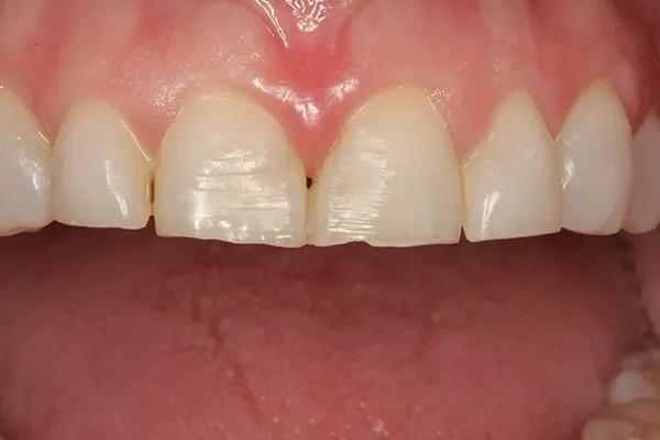 Во время ортодонтического лечения врач-ортодонт устранить жалобу пациентки на наличие “двойного прикуса”, улучшив фиссурно-бугорковые контакты. Ортодонт создал место для будущих реставраций при помощи виниров, наклонив зубы вперед от второго моляра до первого резца на приблизительно 5 градусов (ориентируясь на угол проведенный от режушего края резца верхней челюсти к точкам Sella-Nasion [SN]) и внедрил зубы от 2.2., до 2.7 на 1,5 мм, как было установлено на восковом шаблоне и окончательном моделировании конструкции зубного ряда в состоянии покоя и "нулевой точке клыка".