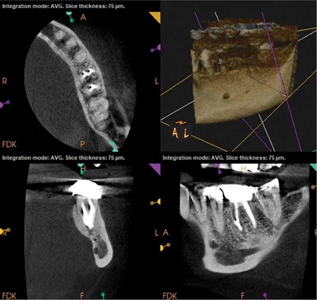 Фото 3: Предоперационная КЛКТ. Отмечаются неполное пломбирование и периапикальная радиолюцентность, связанные с медиальным каналом.