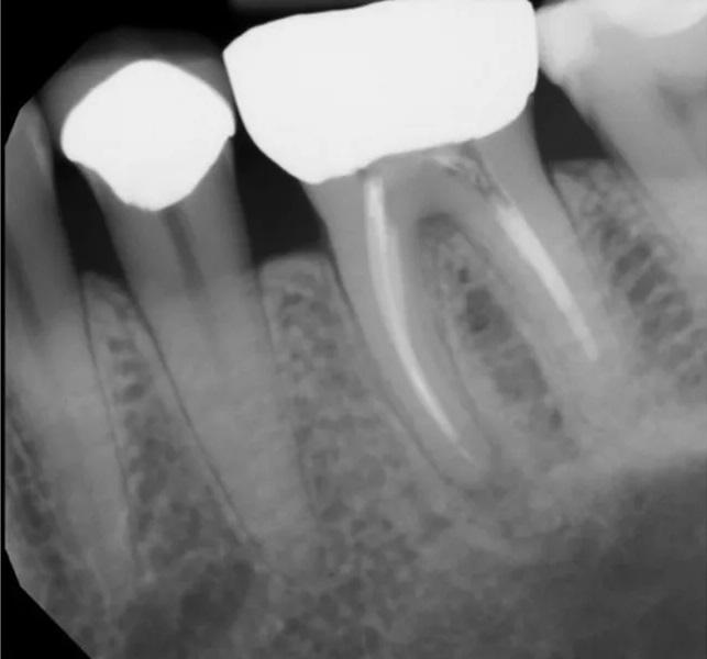Наличие четко определяемых проблем или технических ошибок при первичном эндодонтическом лечении также играет важную роль в прогнозировании исходов повторного лечения. Исследования показывают, что результаты повторного лечения часто обратно пропорциональны качеству первичного лечения. Когда причины неудачи первичного лечения очевидны и поддаются коррекции (например, пропущенный канал или неполная обтурация), прогноз повторного лечения, как правило, более предсказуем, поскольку возможна целенаправленная коррекция выявленных дефектов (фото 2–5).
