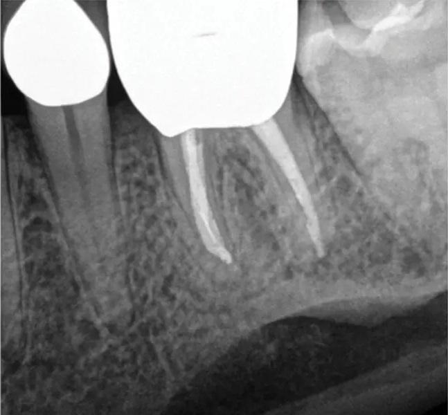 Фото 1. Клинический случай 1. Периапикальная рентгенограмма, демонстрирующая периапикальную патологию, связанную с зубом 36, обусловленную неустраненными осложнениями первичного нехирургического эндодонтического лечения, включая отлом инструмента и коронковую негерметичность. Неустраненные осложнения могут приводить к неудаче эндодонтического лечения и усложнять проведение нехирургического повторного лечения, делая его исходы менее предсказуемыми.