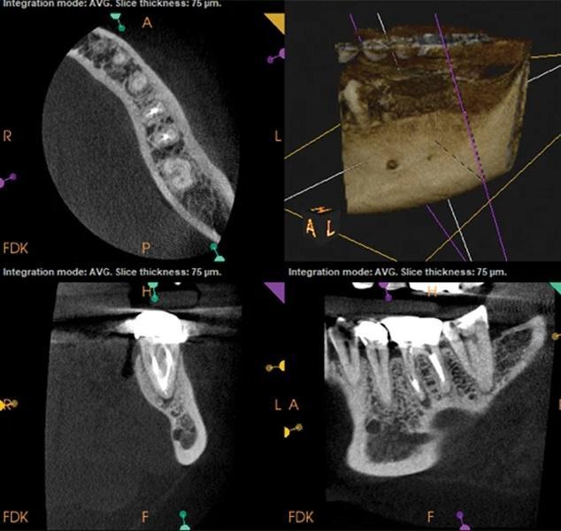 Фото 5: КЛКТ через 3 месяца после лечения. Отмечается регресс периапикальной патологии в области медиального канала.