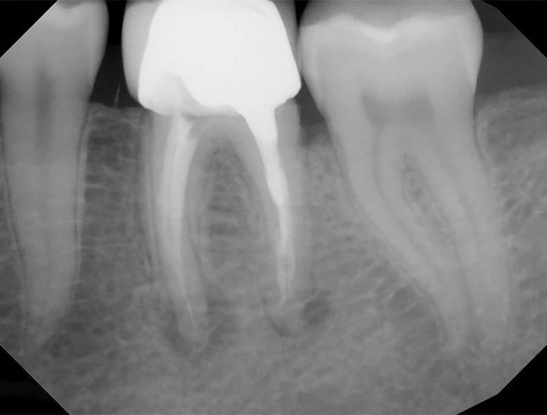 Фото 2: Предоперационная периапикальная рентгенограмма, демонстрирующая ранее не выявленную анатомию в зубе 36.